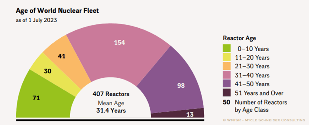 18/06/24 – De gemiddelde leeftijd van de in de wereld operationele kerncentrales bedraagt 32,2 jaar. Het nucleaire park van de VS zit op 43,1 jaar, de Franse kerncentrales zijn gemiddeld 38 jaar oud. Rekening houdend met reeds genomen politieke beslissingen én de gemiddelde leeftijd bij sluiting, besluit het gerenommeerde ‘World nuclear industry status report 2023’ dat er in de komende 7 jaar 141 kerncentrales zullen gesloten worden. Dat is 35%.