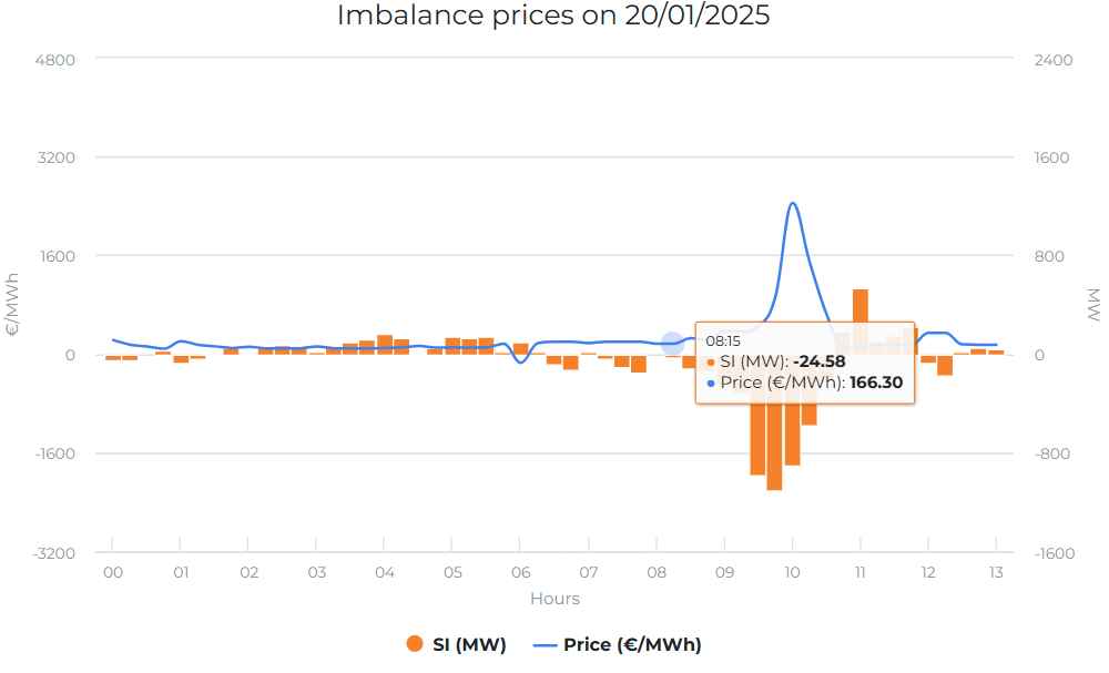 20/01/25 – Om 9u43 deze ochtend viel de kerncentrale van Tihange 1 onverwacht uit, na een technische storing. Dat veroorzaakte meteen een gigantisch onevenwicht van 962 MW op het net, met een bijhorende gigantische kost. Om precies 10u liep de onbalanskost op tot een recordhoogte van 2450 €. Het duurde ongeveer een uur eer her veroorzaakte onevenwicht was hersteld naar normaal. (zie grafiek Elia hieronder)