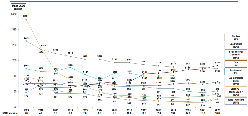 Volgens het gerenommeerde studiebureau Lazard, ism met Berger, is de LCOE voor nucleaire stroom in de periode 2009-2023 gestegen, terwijl deze voor wind- en zonne-energie fors daalde en intussen veruit de goedkoopste manier is geworden om stroom te produceren.