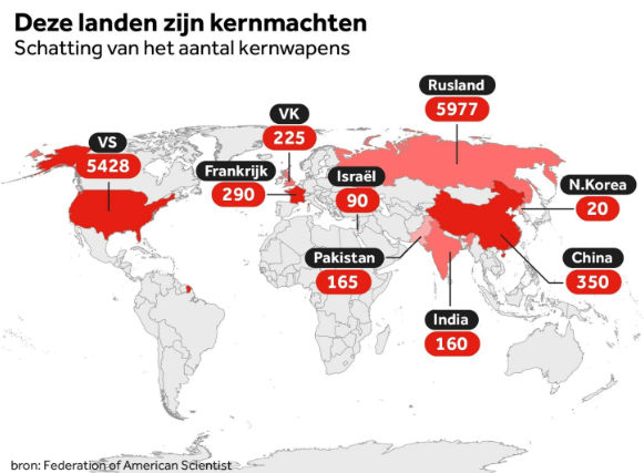 “Geen kernenergie zonder kernwapens, geen kernwapens zonder kernenergie” zei Frans president Macron.- Waarmee hij verwees naar het gegeven dat alle landen die kernwapens bezitten ooit startten met het opwekken van kernenergie voor elektriciteitsopwekking. Op het kaartje hieronder ziet u welke landen vandaag met quasi zekerheid over kernwapens beschikken (Israël en Noord-Korea hebben dit niet publiek bevestigd). Ook in België en andere NAVO-landen liggen met aan zekerheid grenzende waarschijnlijkheid kernwapens, maar deze worden beheerd door de VS.